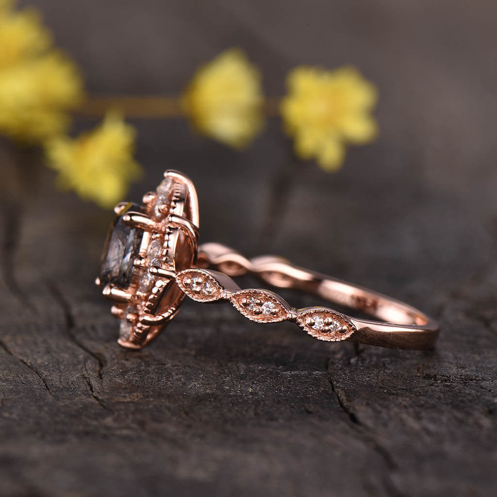 14K/18K Milgrain Filigree Black Rutilated Quartz Diamond Engagement Rings Vintage