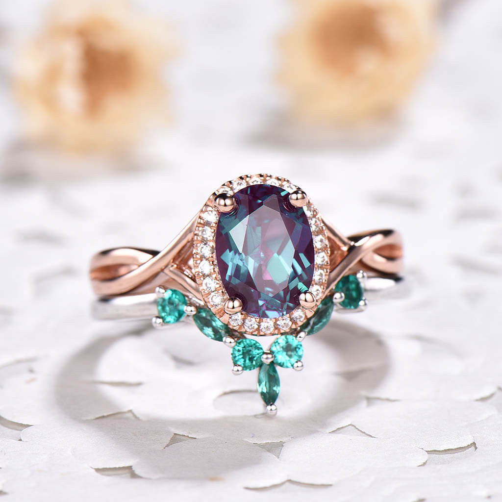Infinity Alexandrite Engagement Ring Set lab Emerald Curved Matching Band 2pcs