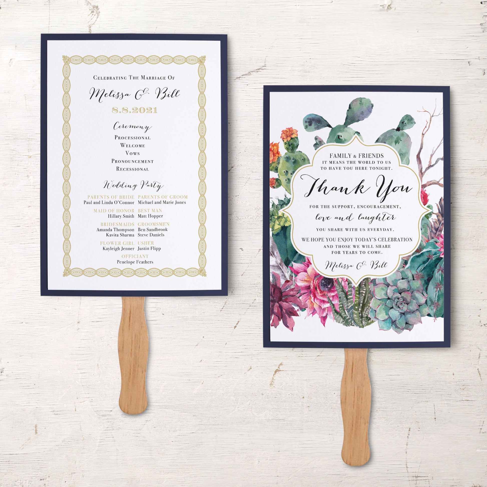 Share the details of your special day with Desert Blooms ceremony fans. Ceremony fans can be customized to match your wedding invites.