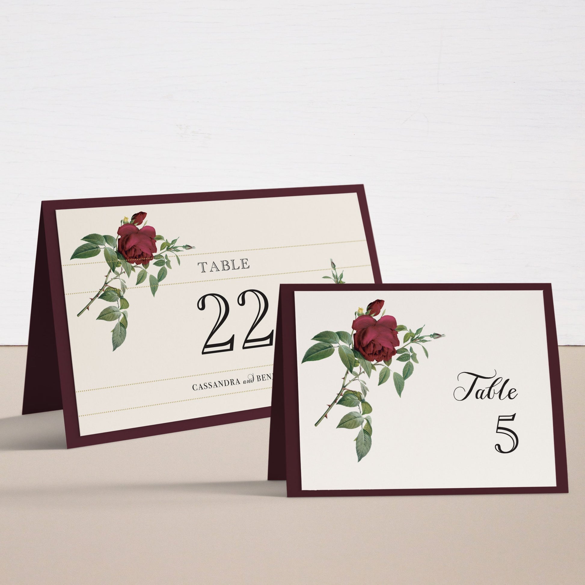 Complete the look with Ivory & Burgundy tented table numbers. These luxury table numbers are double-sided and one can be placed on each table.