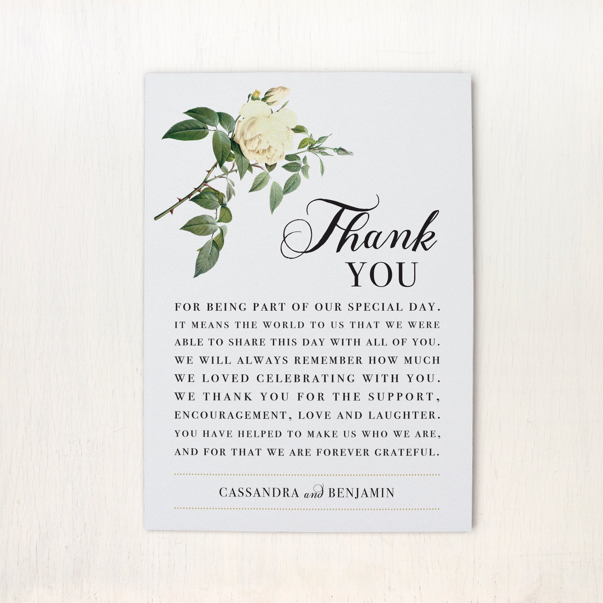 Thank you for being apart of our special day! Place one of these personalized Ivory & White reception thank yous on each plate setting to show guests your appreciation.