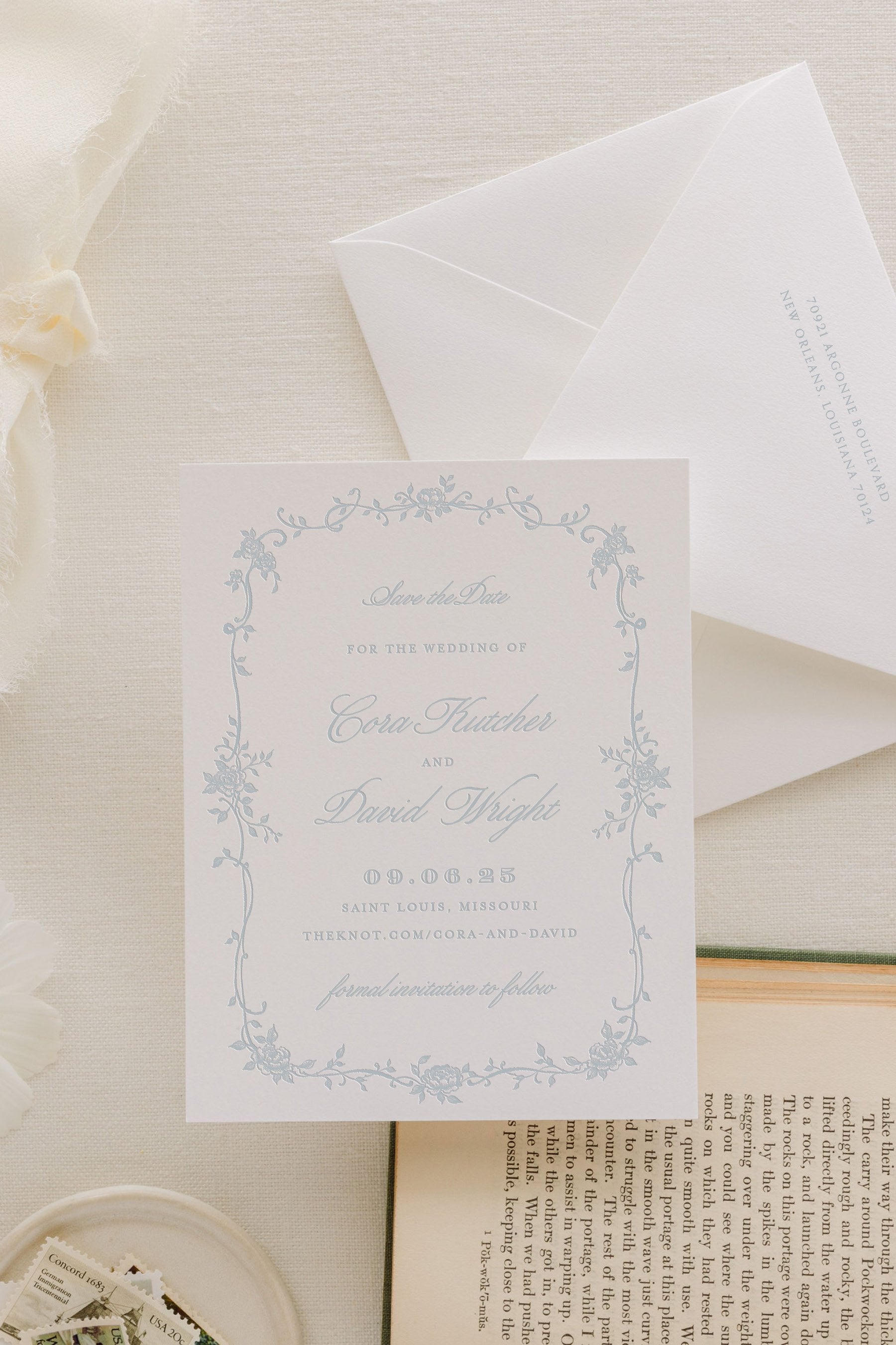 This wedding save the date card is perfect for announcing your engagement and sharing your date. Shown in gold foil on white card stock. To book your suite, select your quantity and paper options and hit “add to cart”. Pricing will update after options are selected.