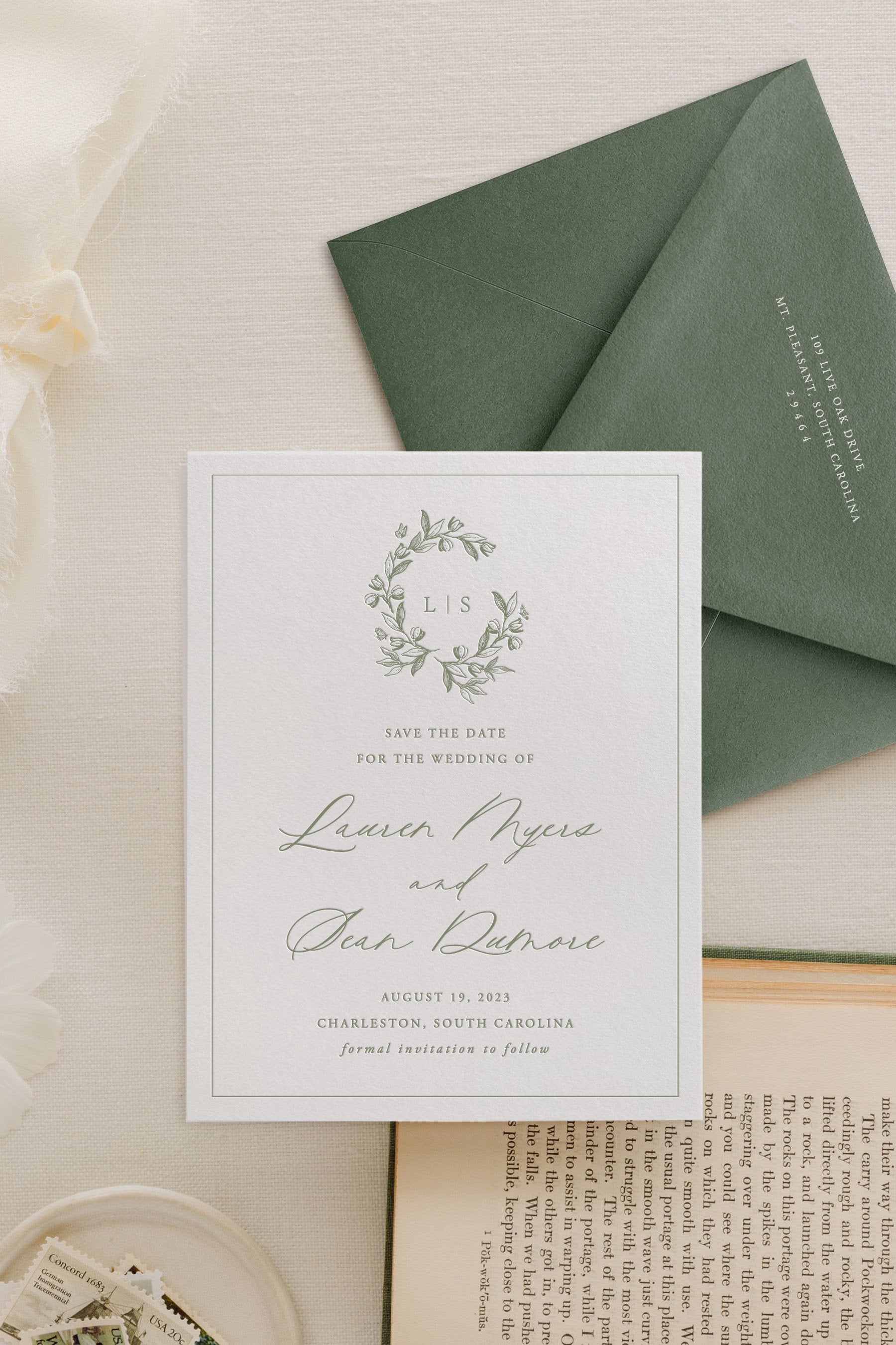 Announce your engagement with this classic, botanical wedding save the date card. Shown in letterpress olive ink on white card stock. To book your suite, select your quantity and paper options and hit “add to cart”. Pricing will update after options are selected.