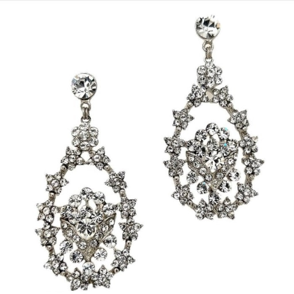 Romantic and radiant, these Dramatic Floral Chandelier Earrings are designed to captivate. Intricately crafted with clusters of brilliant round-cut crystals, their openwork floral silhouette evokes timeless glamour with a modern twist. The graceful teardrop shape frames the face with a perfect balance of sparkle and sophistication. Available in your choice of all crystal or with delicate pearl accents, these statement wedding earrings are ideal for brides seeking an elegant finishing touch. Complete the look with a delicate floral-inspired bridal headband and bracelet. -Genuine Crystals -Approximately 1.5in from widest point x 3in long (3.81cm x 7.62cm) -Rhodium or Vintage Gold plated, non-tarnish finish for brilliance