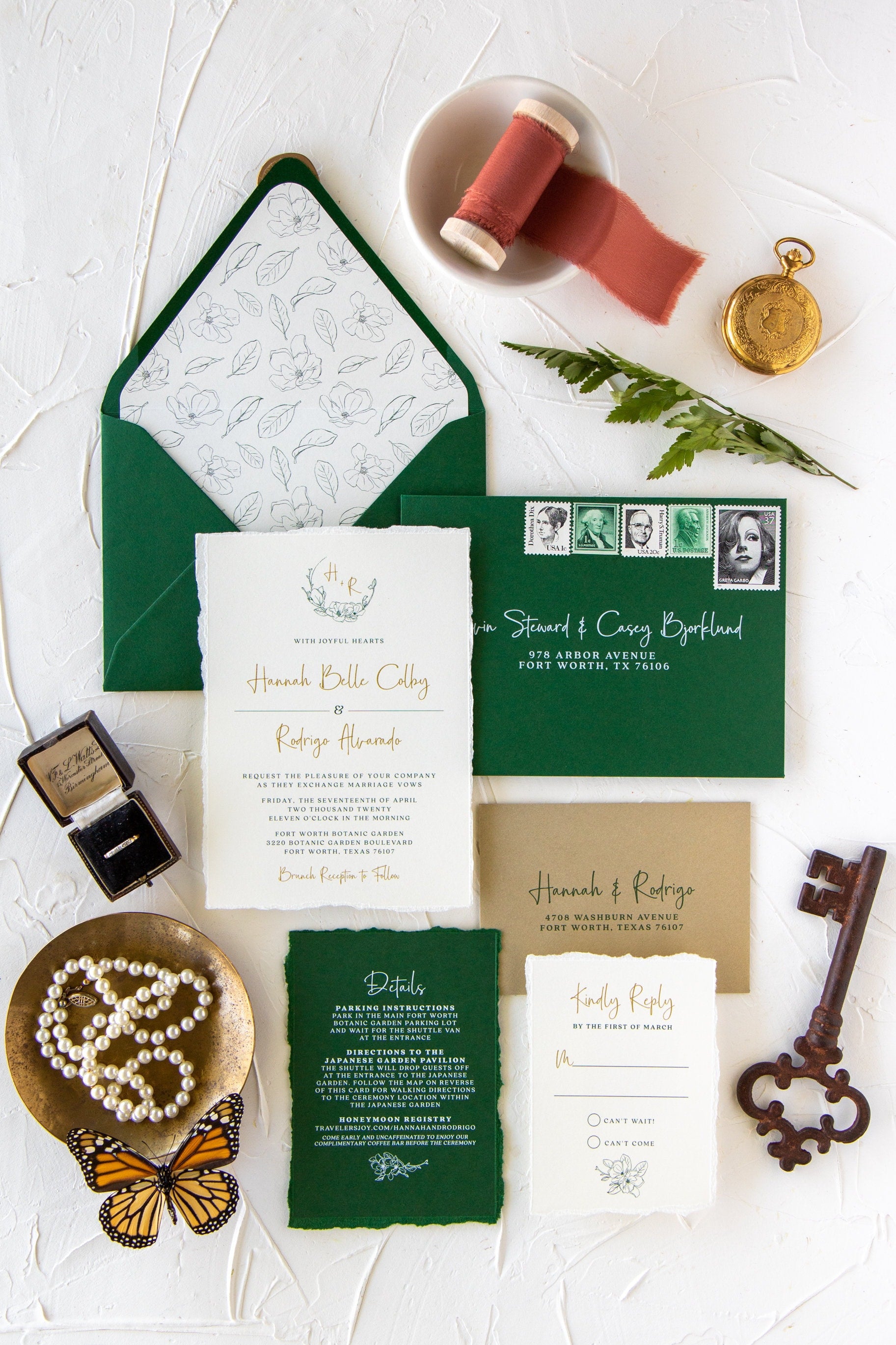 Metallic Gold & Emerald Green Wedding Invitation with Torn Edges, Soft Floral Monogram Wreath, Envelope Liner and Calligraphy — Other Colors