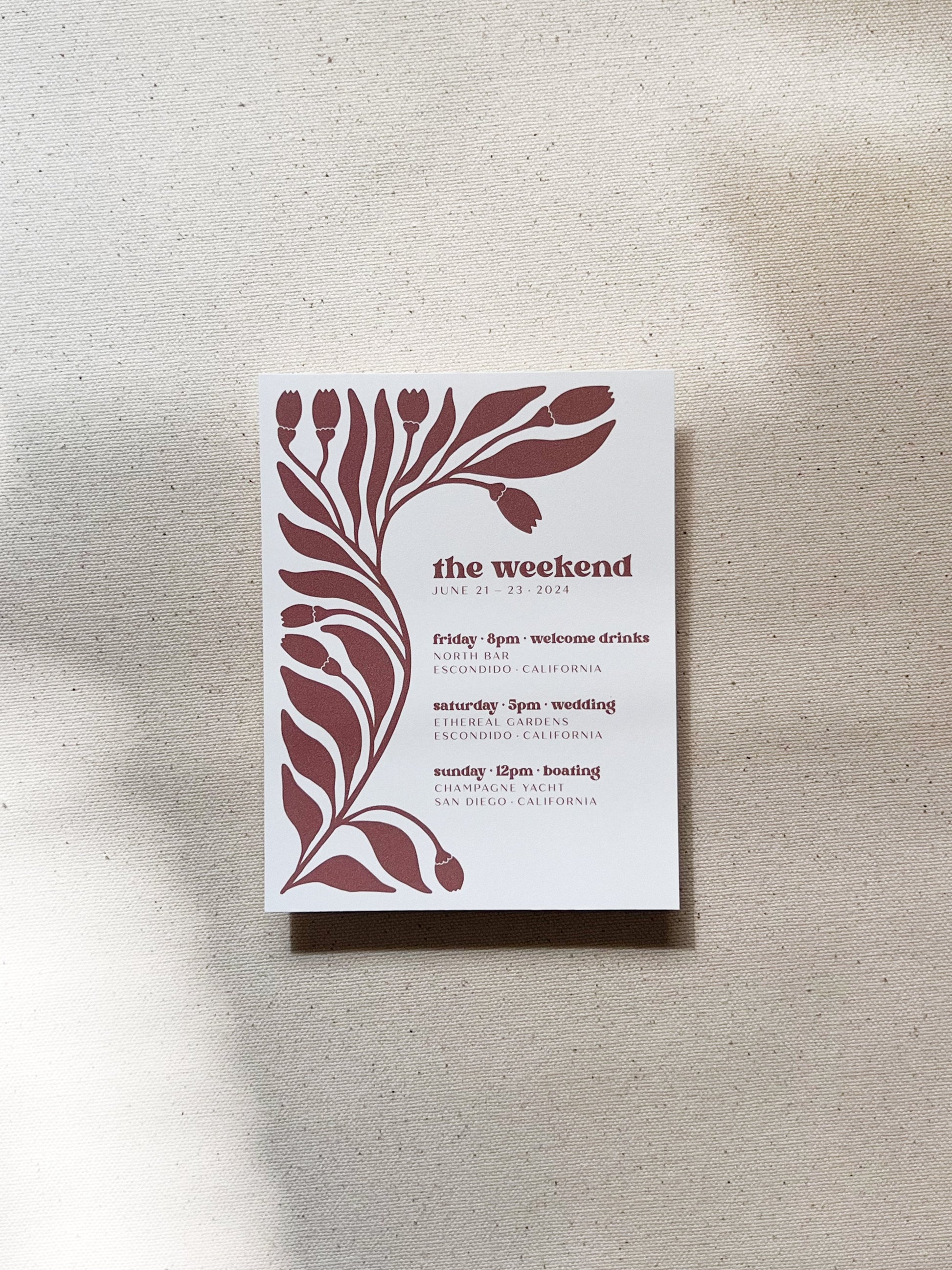 Our modern Abstract Florals invitations designs is inspired by Matisse. Invitations in photo are shown with rose ink and envelopes. THIS LISTING INCLUDES: (1) 4.25 x 5.5 Details Card The details card can be used to list weekend details, website, or any other important information for your guests. For details about ordering from the semi-custom collections, please check out this post. CUSTOMIZATION INCLUDES Color selections for text and envelopes Paper selection Print Process Copy changes 3 rounds of revisions ORDERING Once your order is placed, in 3 business days, we will send a form to collect the wording, color selections, and return address. You will receive your first proof within 5 business days of submitting the form. Once the proof is approved, the pieces are finalized for production. Three rounds of revisions are included. When proofs are approved, please allow 4 weeks for your package to finish production and be shipped to you. FREE SHIPPING FOR ORDERS OVER $200 If your order does not meet the free shipping minimum, you will be sent an invoice to cover the cost of shipping via UPS. Shipping invoice must be completed within 7 days. Your order will ship when the shipping invoice is fulfilled. Shipping within the continental US usually ranges from $20 - $45 with UPS Ground (4 - 7 business days). UPS 2 day shipping is also available upon request. Pieces will arrive unassembled. PRINTING Please note that printing colors may vary between screens, paper options, and printing methods. SAMPLE ORDERS Sample orders include 1 4.25 x 5.5 Details Card (on 130# cardstock or 118# cotton cardstock). Sample orders are not customizable and based on inventory. You will get the same design as the listing but color, including envelopes, is based on what is currently available. COMPLETE THE SUITE Additional items such as full invitation suite, printed envelope addressing, envelope liners, and some day of items can be added to this suite and can be viewed in the Abstract Florals Collection. Available details that are not listed: envelope calligraphy, inner envelopes, ribbons, wax seals, sleeves/wraps, pockets, paper clips, and other items are available to further customize your invitations. Please reach out if you are interested in seeing some of these detail add ons.