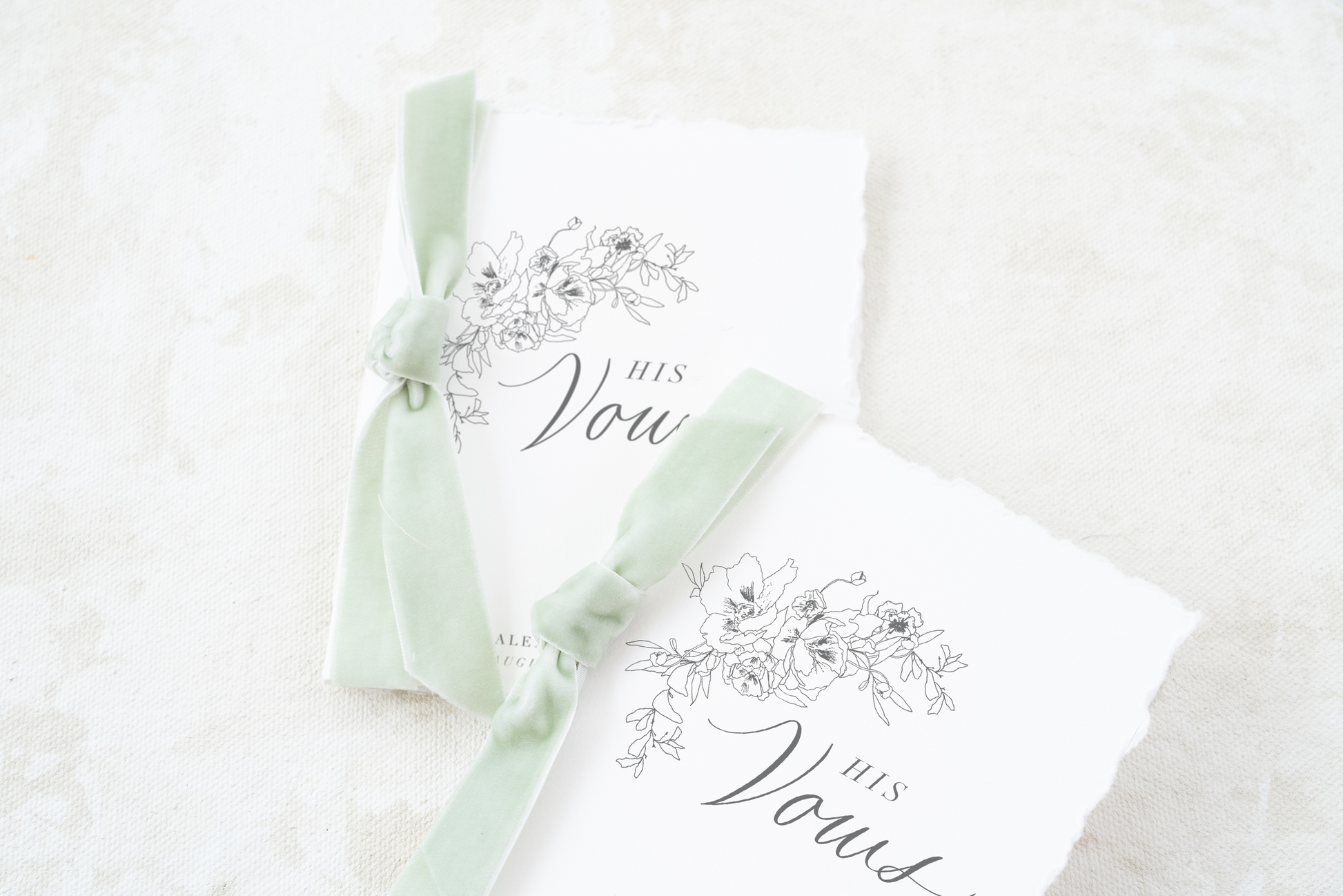 "His" "Her" "Their" handmade vow books with cotton paper cover, 12 blank pages inside, and finished with a silk ribbon. Each order includes with two books that measure about 4.5 x 5 inches. Vow books are made to order and customizable upon request. If you or your partner identify something different than his, her, or their, please select other and in the notes, input the pronouns (ie: zir and her) you prefer for each vow book.