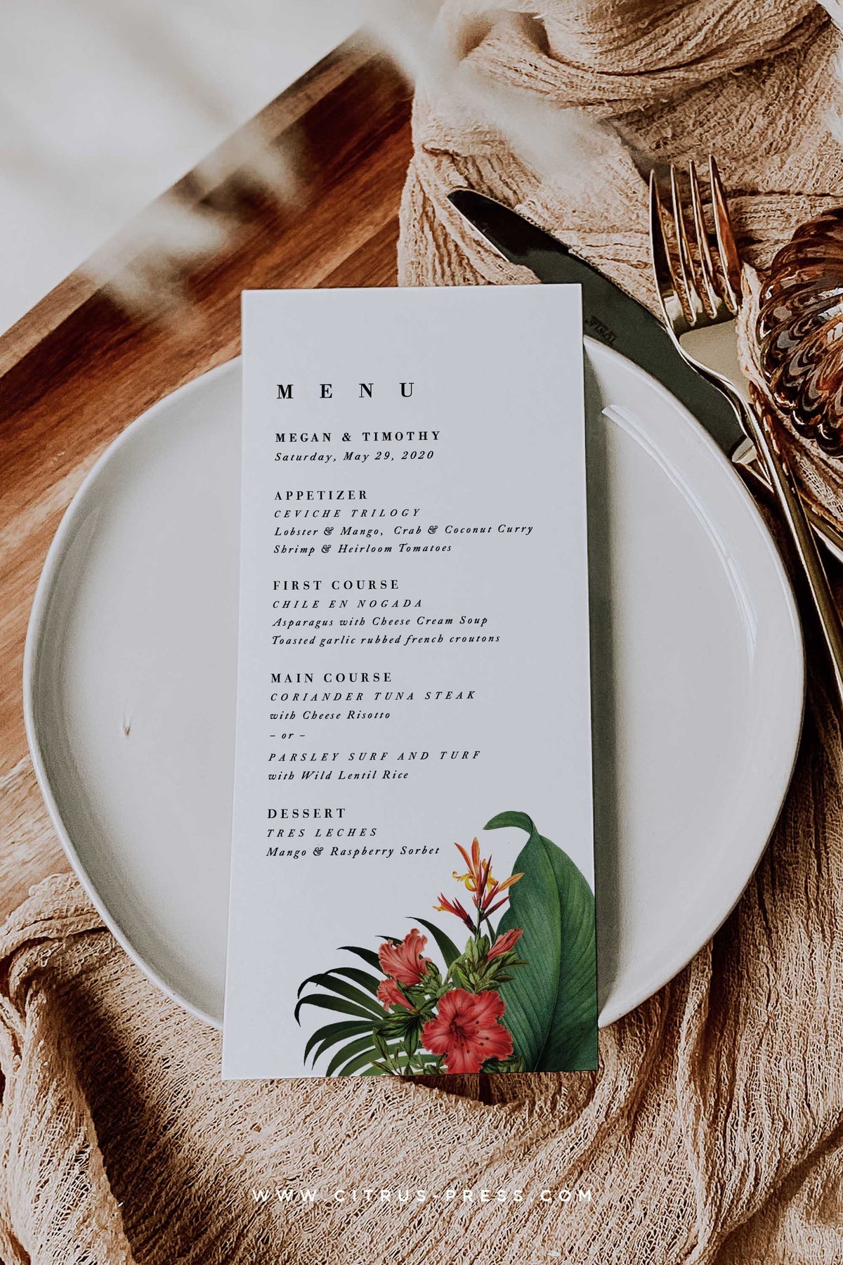 Stunning palm tree leaves and tropical Hawaiian flowers frame this minimalist destination wedding invitation suite. Paired with modern calligraphic typography and banana leaf backer with your monogram, this design has destination wedding written all over it. This suite would also pair impeccably with an outdoor, coastal event.