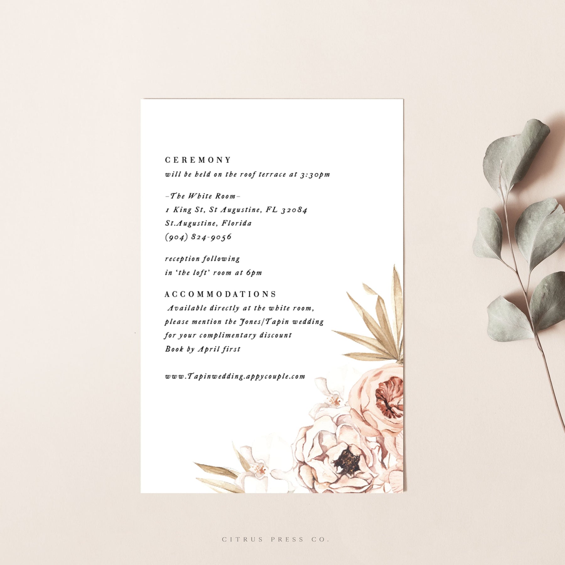 Sun bleached blooms invitation collection with orchids, pampas grass, dried palm leaves and terracotta hues makes this stationery design a stunning and versatile choice for any sunset tropical wedding or a wedding with muted boho touches. Perfect for an evening wedding affair or an elegant and classic look.