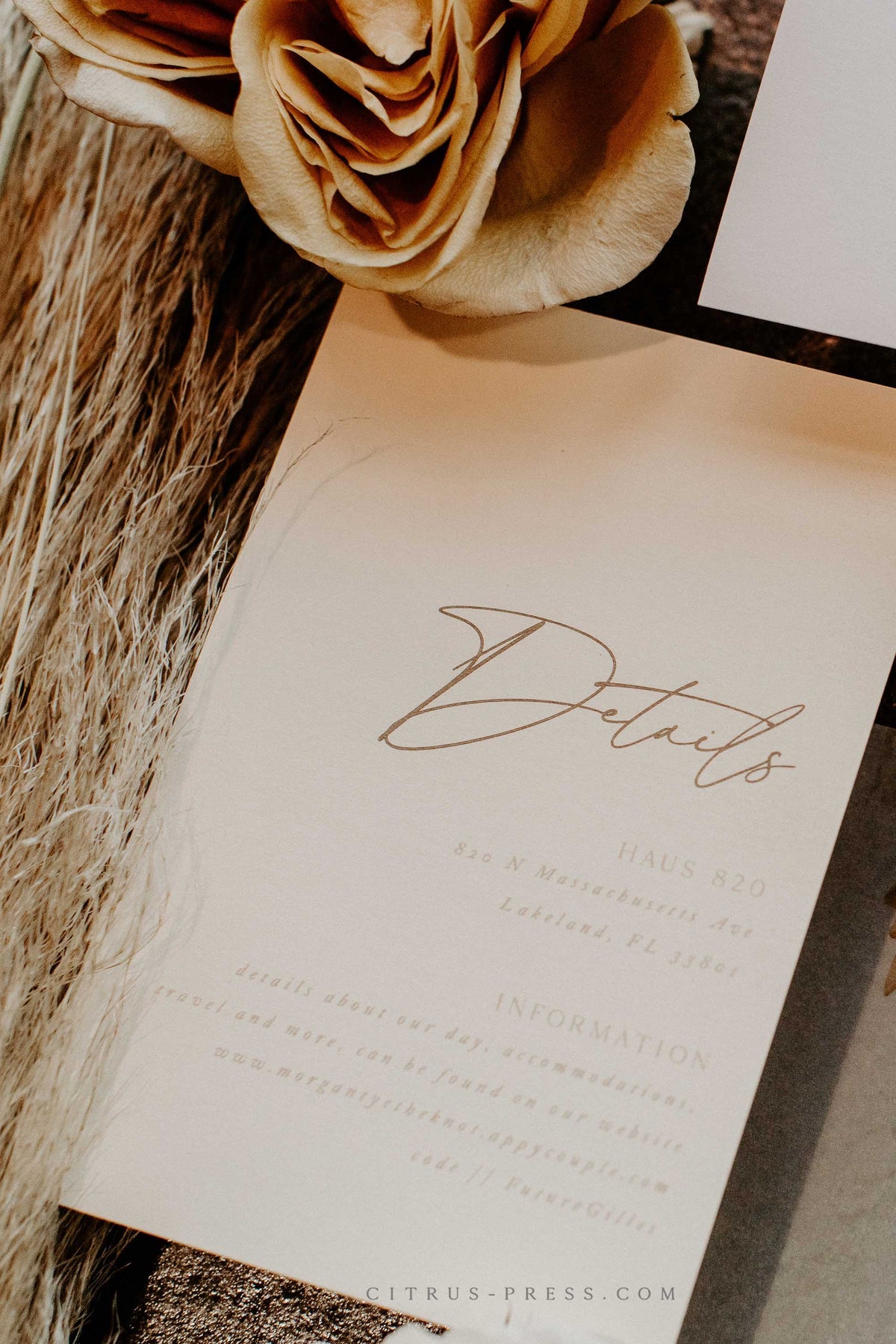 Modern Boho Wedding Invitation with serene sun bleached leaves and dried white florals come together to create a classic and timeless design. This Unique Suite is perfect for a romantic outdoor event or any couple looking for something different for their wedding. Neutral and natural touches makes this invitation suite a perfect statement when announcing your news.