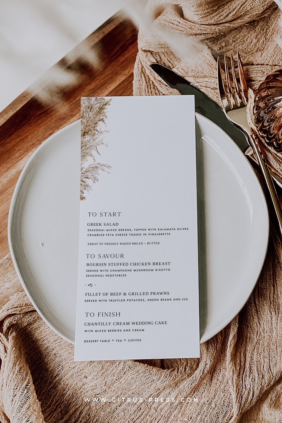 Boho Pampas Grass Wedding Menu Diy Printable Template