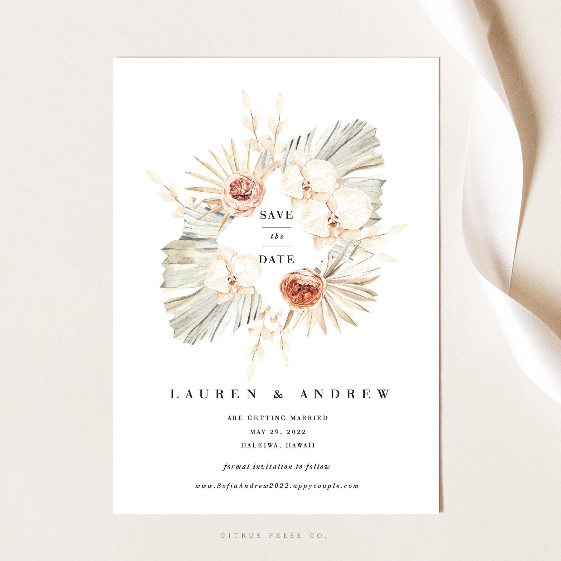 Sun bleached blooms invitation collection with orchids, pampas grass, dried palm leaves and terracotta hues makes this stationery design a stunning and versatile choice for any sunset tropical wedding or a wedding with muted boho touches. Perfect for an evening wedding affair or an elegant and classic look. Create a long lasting impression with these save the dates!