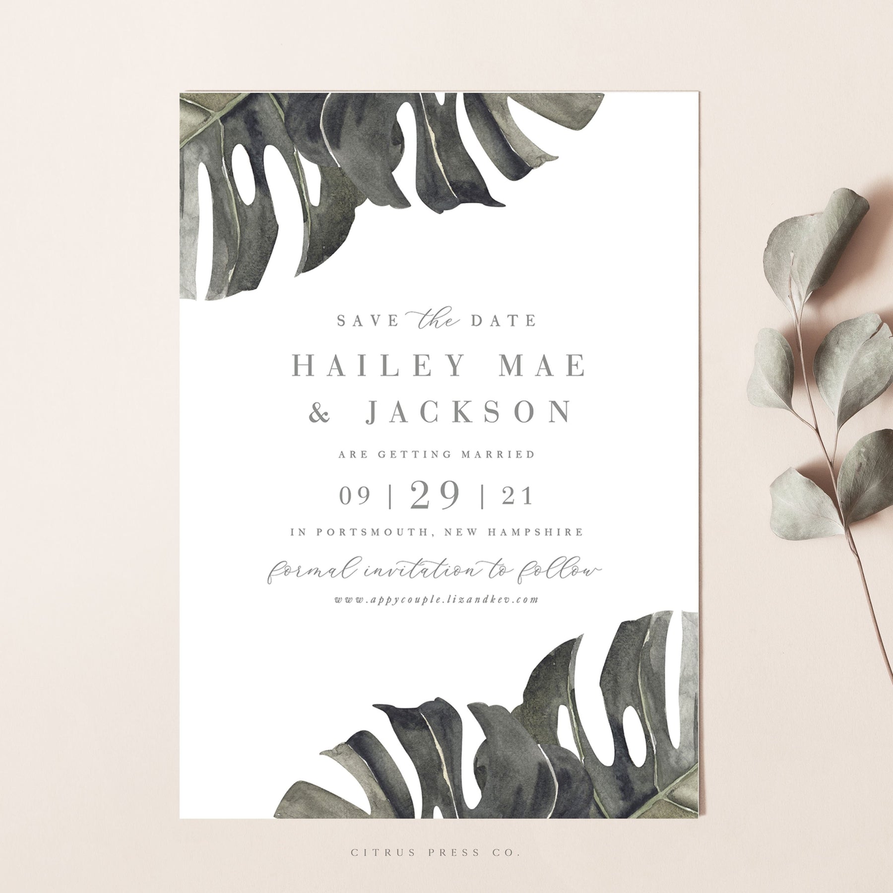 Tropical Destination Wedding Invitation. This simplistic modern invitation designed for any beach wedding affair! Modern font layout and palm leaves and modern typography makes this design a showstopper. Complimenting a variety of outdoor settings but without a doubt, bests suited for a destination, resort-style tropical wedding.