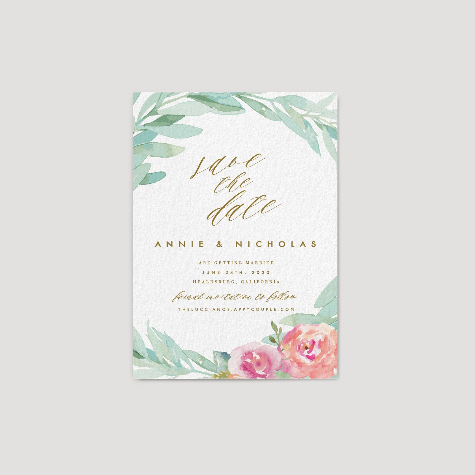 Romantic and dreamy eucalyptus with blush and rose blooms make this watercolor wedding invitation suite perfect for any festive event. Perfect for an outdoor event or an elegant evening gathering.