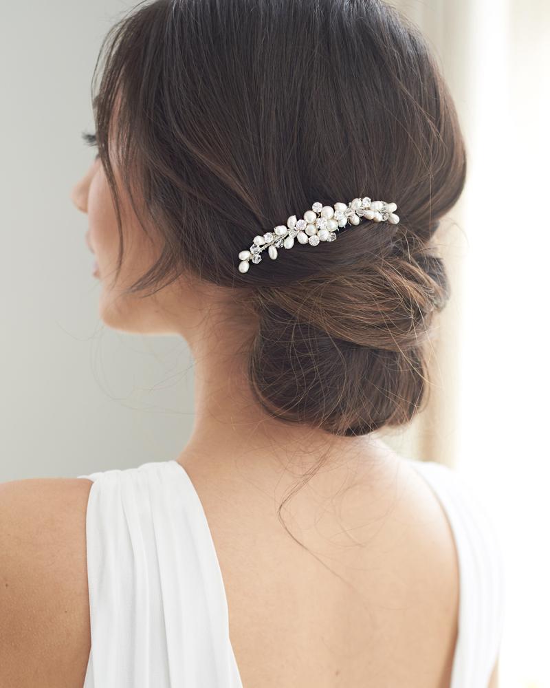 Our Abbey Freshwater Pearl Comb blends elegance with ease. Luminous pearls and sparkling crystals create a soft yet polished look that works beautifully in both flowing waves and chic updos. Hand-wired for flexibility and lightweight for comfort.