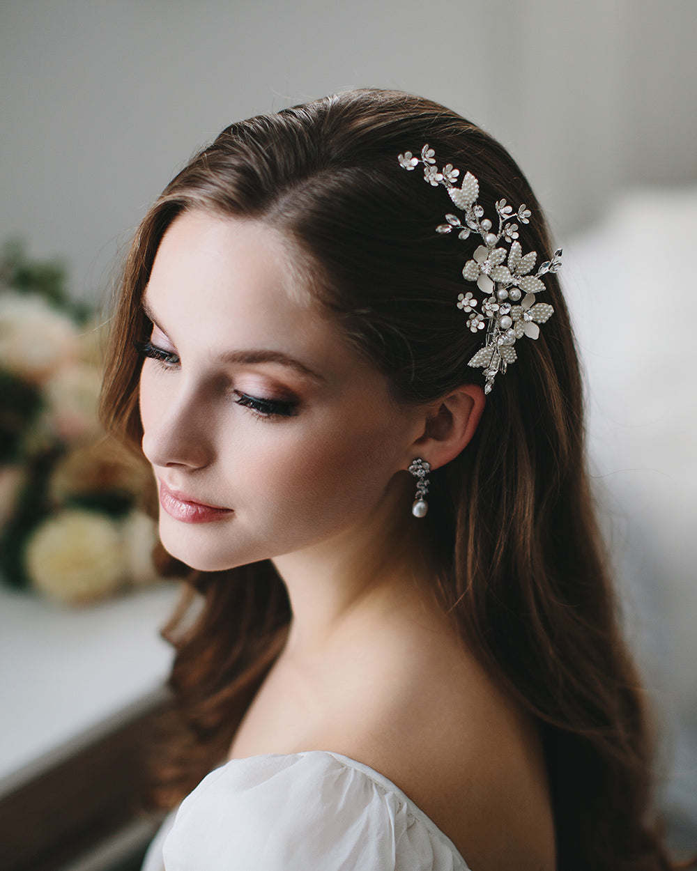 Willow Pearl Bridal Clip is soft, romantic, and effortlessly elegant. Designed with off-white pearl leaves, subtle blush accents, and shimmering crystals, this piece adds the perfect touch of timeless beauty to your wedding day look.