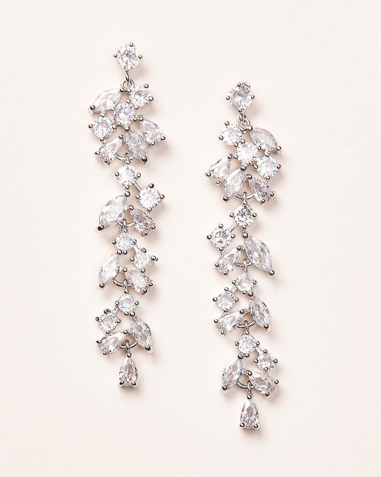 Dramatic and bold, the Tia CZ Dangle Earrings are designed to turn heads. Featuring a cascading mix of oval, teardrop, and round cubic zirconia stones, these sparkling beauties create a striking floral-inspired silhouette. Whether you're walking down the aisle or making a statement at a special occasion, these lightweight earrings add the perfect touch of brilliance.