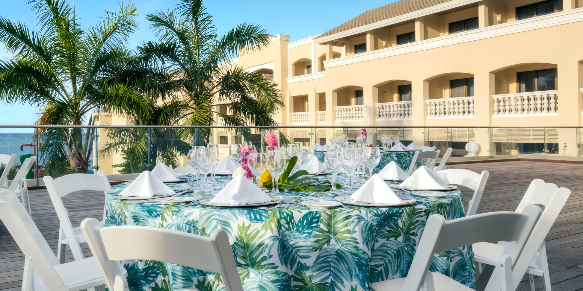 - Chairs: Cross back chairs for guest seating. Palm leaf arrangement on the back row of chairs.