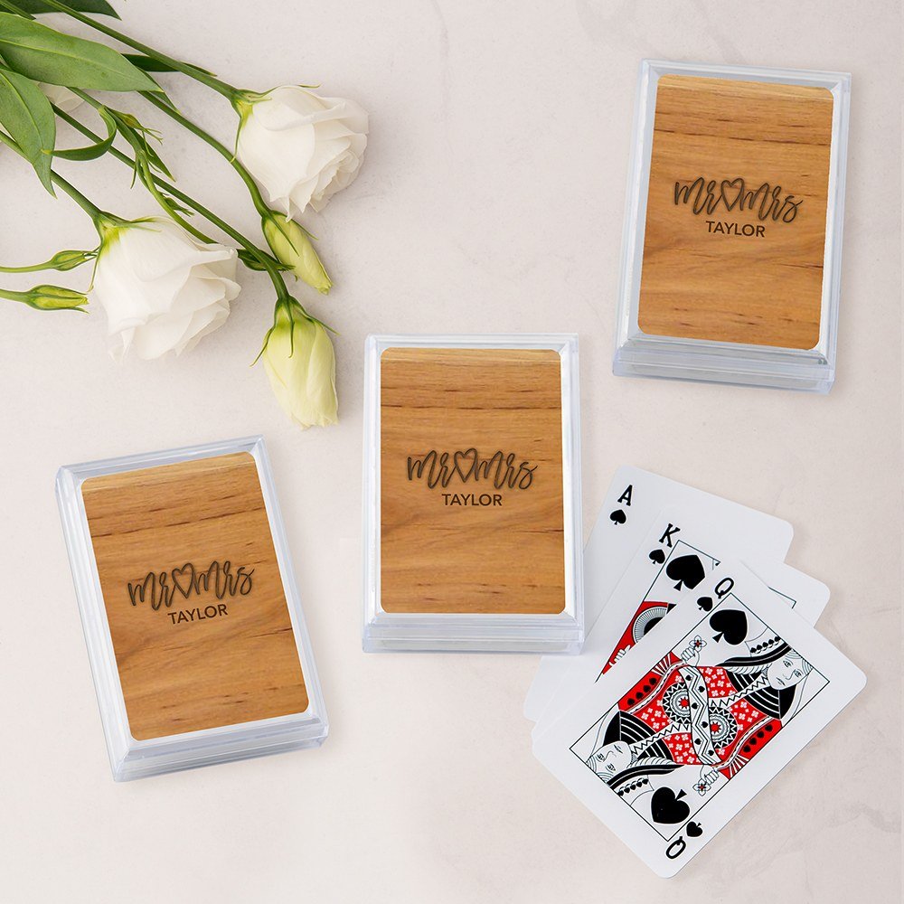 These unique custom playing card favors make any card game fun! Perfect for guests at a bridal shower or wedding reception, this unique custom deck of cards is the best party favor that will entertain any card enthusiast for an inexpensive cheap price. They can be reused for days at the beach, cold winter days, or travelling to far away destinations. They are a useful and practical wedding favor that are great for games such as poker and Go Fish. Enjoyable for adults and children, they make a creative accessory for all brides to add to their wedding day! Featuring a rustic woodgrain and cursive Mr. and Mrs. print, these cool cards can also be personalized with monogrammed initials, the couples soon to be shared last name, or wedding date to add a custom, more personal touch. They also come packed in an individual plastic box. Specifications - 2 1/4" (L) x 3 1/2" (H) - Coated Paper Cardstock - Each Deck Packed In Individual Plastic Box - Bridge Card Size
