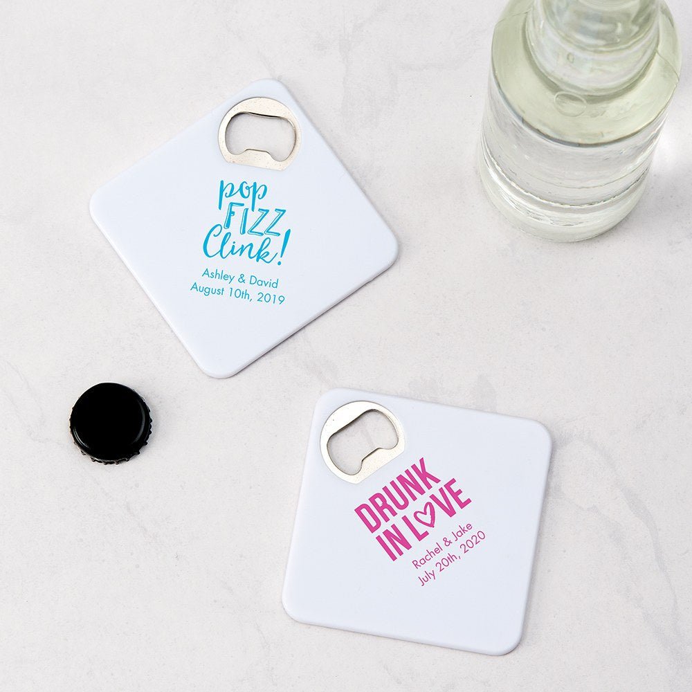 A small token for your guests, the personalized white plastic drink coaster is a unique choice for a table favor. Not only will it protect tables from drink rings, but the built-in metal bottle opener convenient for taking the cap off your beer bottles. With a variety of print designs and print colors to choose from the inexpensive white coaster can be customized for your special occasion. It€™s a cool, cheap souvenir for guests at your wedding reception, bridal shower, or engagement party and with the attached bottle opener, guests can use the unique, printed coaster at the event itself. There are even designs available for other celebrations like a birthday, anniversary, graduation, or baby shower. Then, with an additional two text lines available for your own custom text, the coaster giveaways can be further personalized with names, dates, monogrammed initials, or a short message. Specifications - 3.7" (L) x 0.1" (W) x 3.7" (H) - Plastic, foam and metal - Non-slip foam base helps prevent drink spills