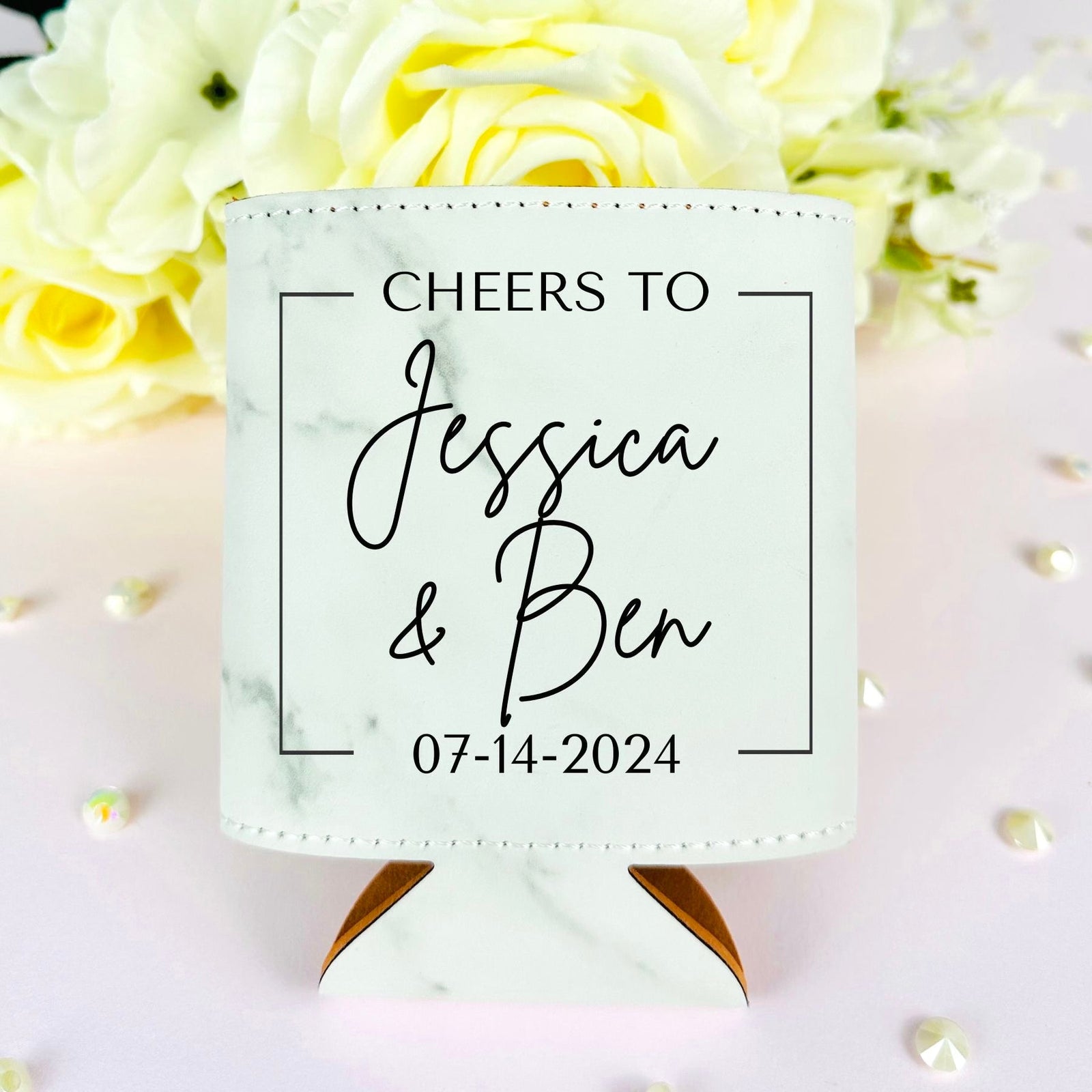 These Koozie Wedding Favors are the perfect way to commemorate your special day. Laser engraved and made of faux leather, these koozies will keep your guests' drinks cold and their hands warm. Featuring your personalized design, these favors make a great addition to any wedding reception. Give them out as special keepsakes or as party favors, and your guests will be sure to remember your special day. How To Personalize: You can personalize these koozies by using the drop down menu and text fields above the add to cart button and following the example below: Names: Jessica & Ben Date: 07-14-2024 Details: Choose from 12 different color options Holds a 12 oz can Made of faux leather Personalization is laser engraved