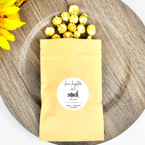 Introducing our wedding favor, Late-Night Delight! This charming midnight snack bag can be filled with tasty treats to satisfy late-night cravings. With its stylish packaging and delightful surprises inside, it's the perfect companion for dancing or cozy moments. Show your appreciation and keep the celebration going with Late Night Delights. Treat your loved ones to a memorable late-night indulgence and let the magic of your wedding night continue! How To Personalize: Names:Chris + Melissa Date: 7.20.2025 Details: Choose from 2 different sizes (2 oz. or 4 oz.) 2 oz bag measures 4" x 6" x 2" 4 oz bag measures 5" x 8" x 2.5" Kraft paper for natural look Airtight zippered to lock in freshness Thick barrier material to protect contents Heat sealable FDA and USDA compliant Snacks not included