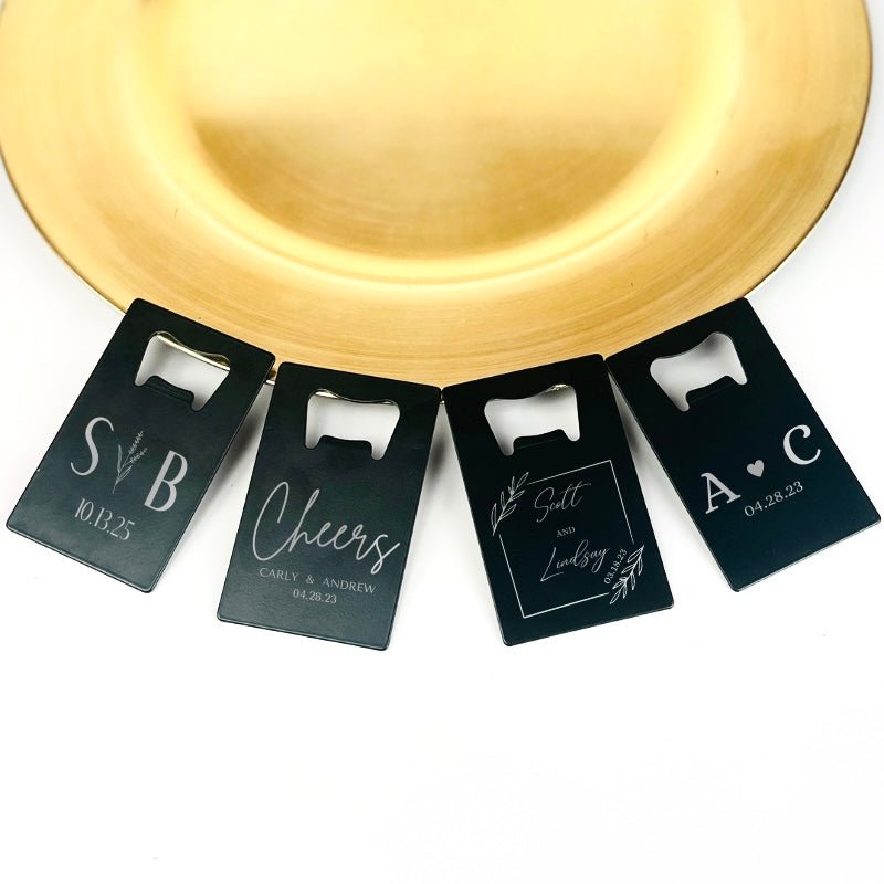 The best favors are not only thoughtful but also useful, so thank your guests for coming with this personalized credit card bottle opener! Thin enough to slide intoa wallet but sturdy enough to stand the test of time, these bottle openers are sure to wow your guests.Perfect for popping cold ones on your big night and used with gratitude for years to come. Personalize your credit card bottle openers by using the drop down menu above and following the text fields provided! Names will be engraved exactly as provided in the text fields. DETAILS: Personalization on one side only Made of stainless steel with a black matte finish Laser engraved Measures 3 3/8" x 2 1/8" (for perfect placement in a wallet) Choose from 8 customizable designs!