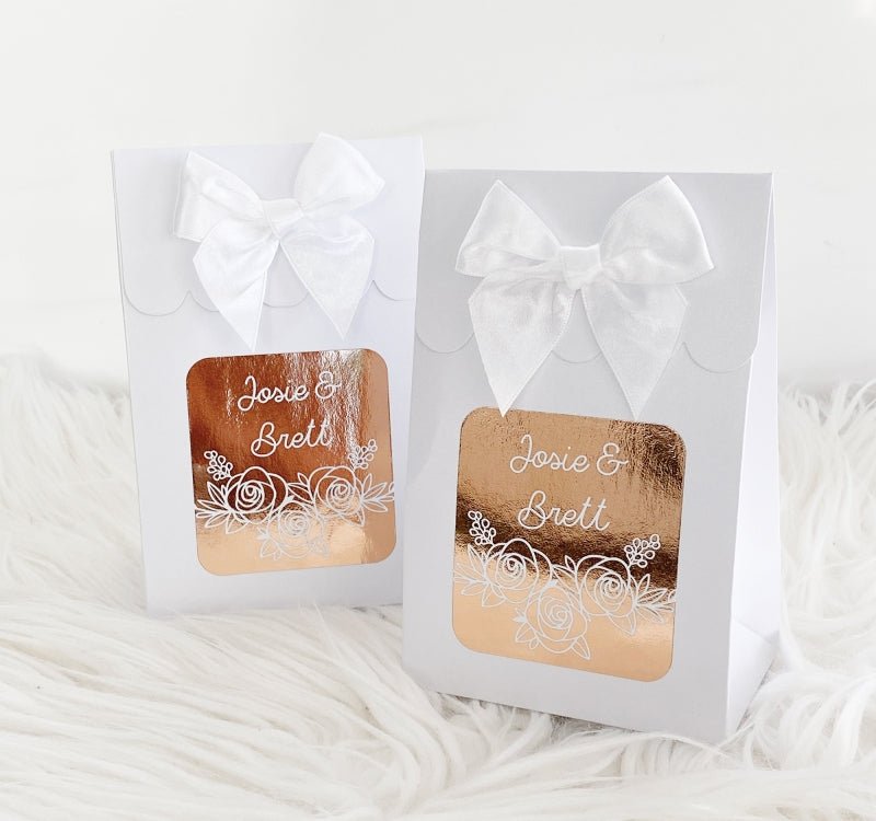 In terms of personalized wedding favors, nothing beats something that you do, cook or bake yourself. So gather your baking tools and unleash your oven expert prowess to create treats that you can distribute as your token of appreciation for the people who will stand by you as you say €œI do€�. Oh, and when you are done, put them in these Personalized Foil Favor Boxes. Boxes stand on their own and have a scallop edge fold-over design that ensures a sturdy, secure and nice packaging presentation of your goods. Bows of the same color as the boxes are also part of the package. However, you might have to do some assembling like attaching the self-stick labels and stick-on satin bows to the boxes. Product Details: Size: 5.75" x 3.75" x 2.5" Foil Color Options: Gold, Silver, Rose Gold Minimum Order: 2(set of 12) Max Characters per line (including spaces): Line 1: 20 Characters, Line 2: 15 Characters Note:Boxes arrive separately from the labels. Some assembly required (attaching the self-stick labels and stick-on satin bows to the boxes). Boxes come with bows that are thesame color as the boxes.
