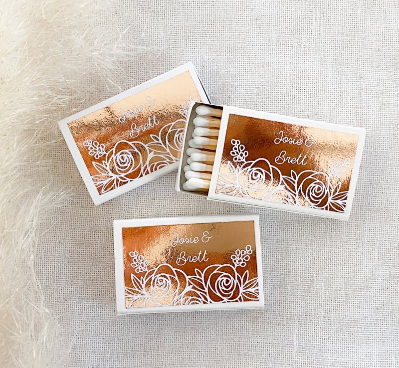 Add light and glimmer to your wedding both at the same time with this Foil Matchbox Favors that come in 50 per set for more delighted and appreciated guests. This classic wedding favor contains approximately 22-24 matches with white tips in one box. The said tip colors are fitting to the occasion as it is a great contradiction to its color once lit. Each matchbox is embellished with a foil cover on top for that added glamour and sparkle in the souvenir table or even in the venue as its variety can adapt to any theme or motif. Foil color options are Rose Gold, Gold, and Silver. It may be personalized with the maximum characters of 20 for line 1 and 15 for line 2. Product Details: Size:38" x 2.25" Foil color options: Gold, Rose Gold, Silver Each matchbox contains approx. 22-24 matches with white tips Some assembly is required as boxes arrive separately from labels Max Characters (Spaces Included): Line 1: 20 Characters, Line 2: 15 Characters