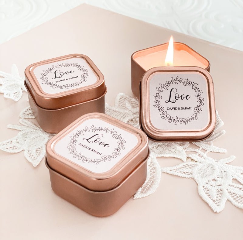 Bring the flower, the light, and the scent with these trendy floral tin candle wedding favors! These essentials are sure to be a hit for all of the guests at your big day. With multiple design options and colors, a charming floral scent, as well as your own text personalization, these favors will be a memory all will cherish after your big day is said and done. Details: Size:2"W x 1.4"H. Weight: 2 oz. Max Characters Per Line (Including Spaces): Script Text: 20 Characters, Bold Text: 20 Characters Some Assembly Required:Attaching the self-stick labels to tins Minimum Order: 12