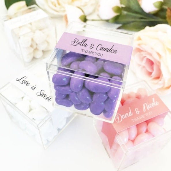 Package your most saccharine treats such as macaroons, candies, chocolates, gummy bears, or any other small edible treats in these durable and Clear Favor Boxes. Made from acrylic, these transparent and square keepsakes may be embellished with customizable tags to make it a nice event favor or token. Choose your label colors from White, Blush, Dark Pink, Coral, Lilac, Mint, Taupe, Black, Grey, and Navy to match your wedding theme. Your names, initials, or short messages will be printed in either of the text style choices; Script and Bold. The minimum order for these boxes is 20 which allows you to fill in enough ones with treats of your choice and give them to your selected favorite people. You may have to stick the labels onto the boxes by yourself as they arrive separately. Product Details: Size:2"H x 2"W Label Colors: White, Blush, Dark Pink, Coral, Lilac, Mint, Taupe, Black, Grey, and Navy Text Style: Script and Bold Max Characters per line (including spaces): Script Text: 16 Characters, Bold Text: 20 Characters Acrylic boxes arrive separately from the labels. Some assembly required Minimum Order: 20 *Contents not included