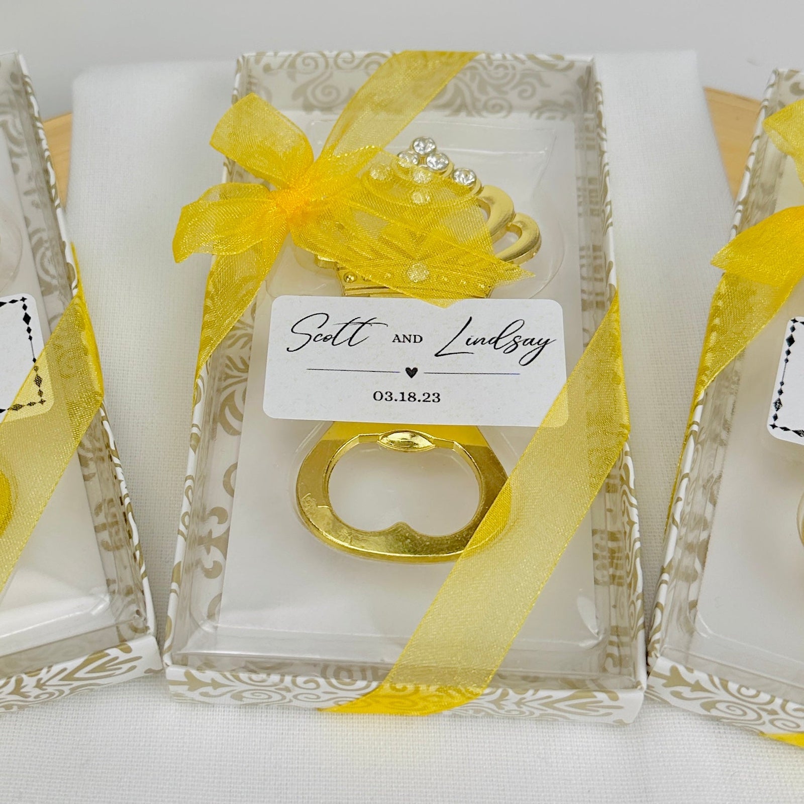 This gold crown bottle opener wedding favor is the perfect way to add a touch of regal style to your special day. Crafted from sturdy metal with a beautiful golden finish, this unique opener features a crown-shaped handle that's sure to make a statement. Perfect for gifting to guests, this charming opener is sure to be a hit at any wedding or special celebration. Show your guests your appreciation by adding a personalized label for a unique touch! Details: Made of high quality zinc alloy with a gold finish Each crown bottle opener arrives packaged in an individual gift box Opener: 120 x 60 mm Gift box: 50 x 24 x 30 cm Personalize your labels using the drop down menu and filling out the text fields accordingly Some assembly required: placing labels on boxes