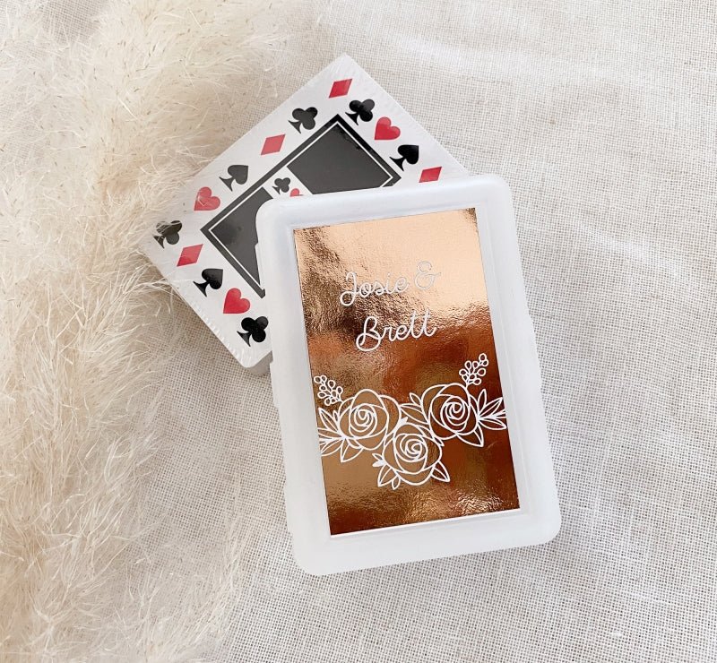 Say €œthank you€� with a shimmer or make your lady friends feel appreciated with a touch of novelty by giving these Foil Playing Card Favors. Surely you can arouse the competitive nature of each recipient as they dive into shuffling the cards at once and dealing them to start a game. Your wedding will be a spectacular event all the more as the guests bring home a piece of the fun that they have felt from the experience. Card cases arrive separately from the labels so you may need to do some simple assembly such as attaching the self-stick label to the card cases for a more personalized touch. Go on and be clever with your choice of words to put on the label as you are allowed to put up to 20 characters on the first line and 16 characters on the second line, both including spaces. Product Details: Size:25"W x 3.5"H Some assembly is required as card cases arrive separately from personalized labels Max Characters (Spaces Included): Line 1: 20 Characters, Line 2: 15 Characters Minimum Order: 12 boxes