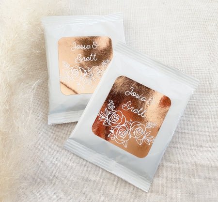 Warm the hearts of your guests and include their hearts with these Personalized Foil Hot Cocoa Favors. Each single serving white gloss pouch contains 1 oz. of Premium Blend of powdered Hot Cocoa mix that is sure to please the palate. The front part is customizable with a sticker label while the back has printed directions. Customize the labels with either Rose Gold, Gold, or Silver foil to match your wedding theme and use the maximized characters per line: 20 on the first and 15 on the second. Optional whisks come with a white satin bow and a heart-shaped handle that has a small opening so you can easily slip it through a hole. If you chose the whisk to come along the hot cocoa mix, you might have to do some assembly yourself such as punching a hole in the hot cocoa package and slipping the heart handle of the whisk through it. Product Details: Size: 5" x 3.25" Foil Color Options: Gold, Silver, Rose Gold Minimum Order: 24 Max Characters per line (including spaces): Line 1: 20 Characters, Line 2: 15 Characters Note:Some assembly required (punching a hole in the hot cocoa package and slipping the heart handle of the whisk through it.) Each single serving white gloss pouch contains 1 oz. of Premium Blend of powdered Hot Cocoa mix. Optional whisks come with a white satin bow and a heart-shaped handle