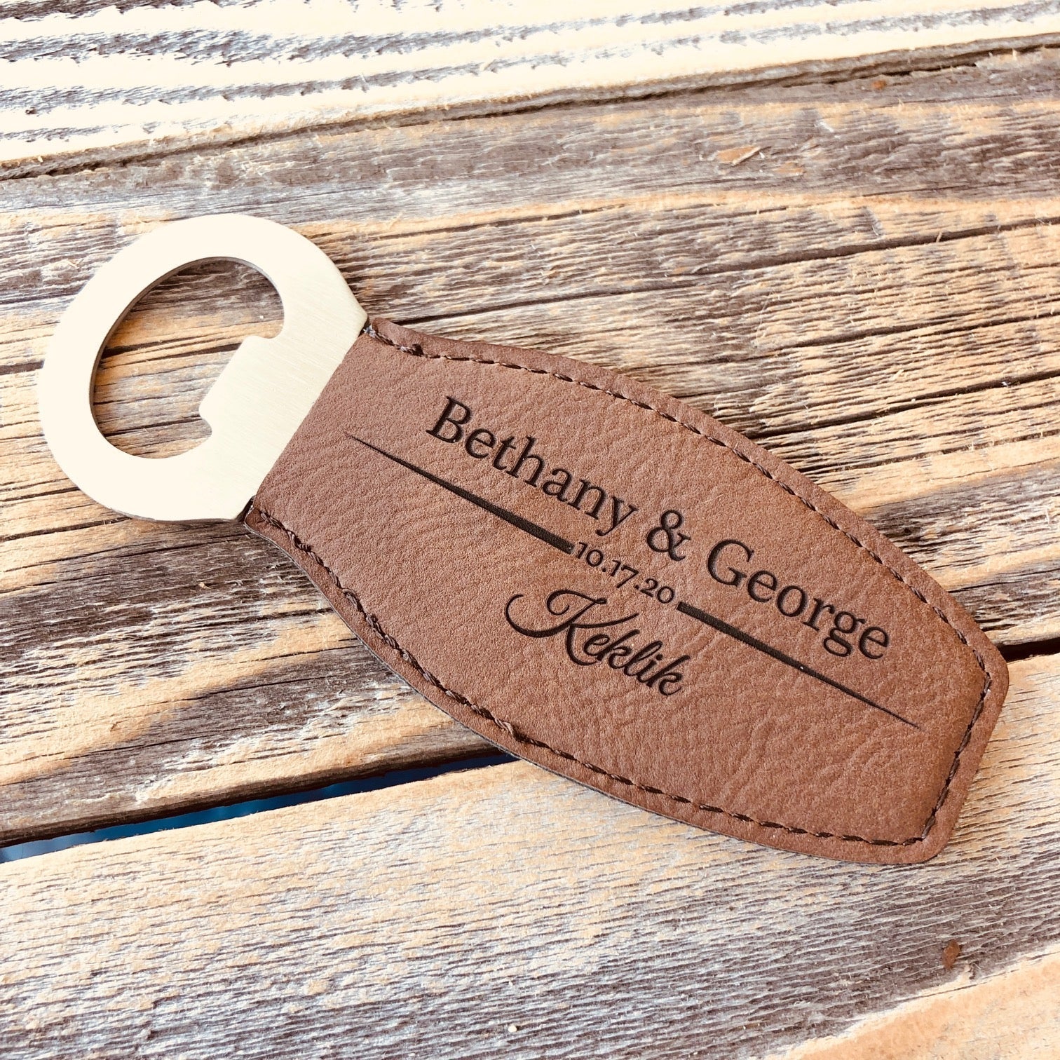 Not only does this rustic-styled bottle opener complement any themed wedding or bridal shower, but it also doubles as a magnet! This unique favor is the perfect way to say thank you to your guest, bridesmaids, or groomsmen. Personalize these favors with your choice from 5 different colors. Also,add your names, the date, and the last nameso your guest will never forget your special day! Personalization: Line 1: First Names Line 2: Date Line 3: Last Name Details: Length:1 3/4" Height:4 5/8" Thickness:3/16" Metal opener: 1 5/8" x 1 1/4" Material: Stainless Steel End, laser engraved leatherette handle