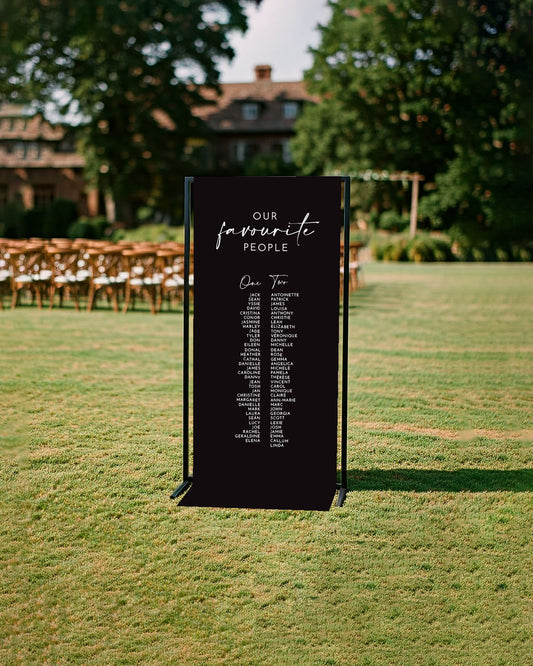 Fabric table plan featuring a folded top edge pocket. This sign can be hung using a stand or by feeding ribbon through the top pocket and fixing either end.