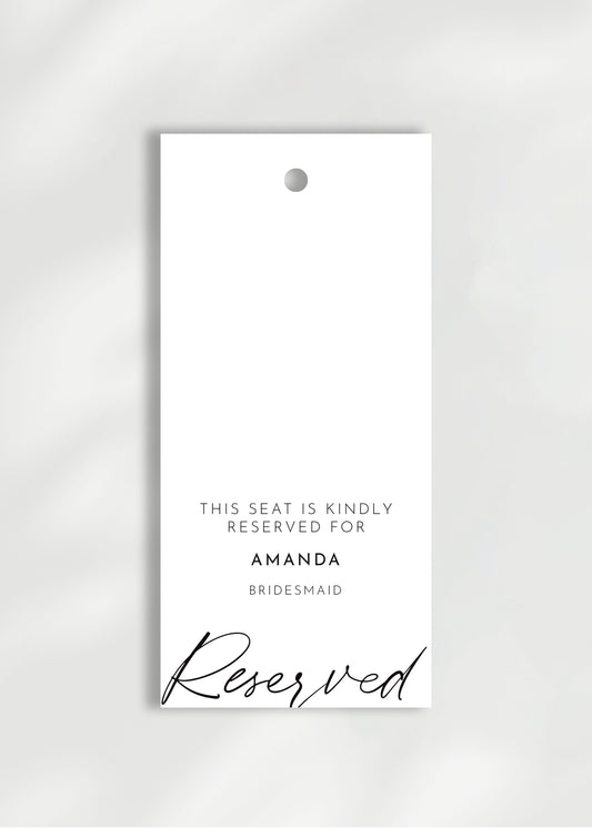 Ensure your ceremony seating is perfectly organised with our personalised reserved ceremony seat tags. Printed on our signature 300gsm textured card, these elegant tags are designed to be tied to chairs with ribbon, reserving special seats for the wedding party. A must-have for any well-coordinated wedding, these seat tags add a sophisticated touch while ensuring your guests know exactly where to sit.
