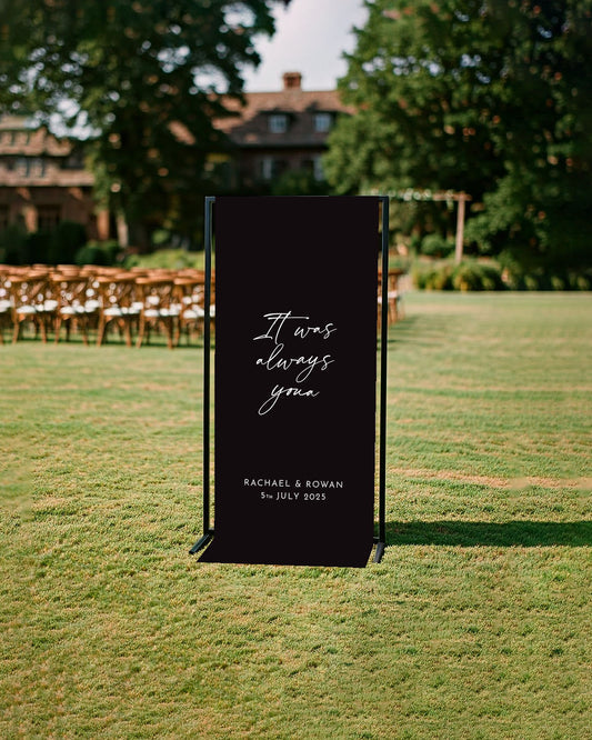 Fabric table plan featuring a folded top edge pocket. This sign can be hung using a stand or by feeding ribbon through the top pocket and fixing either end.
