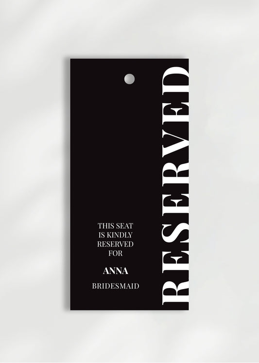 Ensure your ceremony seating is perfectly organised with our personalised reserved ceremony seat tags. Printed on our signature 300gsm textured card, these elegant tags are designed to be tied to chairs with ribbon, reserving special seats for the wedding party. A must-have for any well-coordinated wedding, these seat tags add a sophisticated touch while ensuring your guests know exactly where to sit.