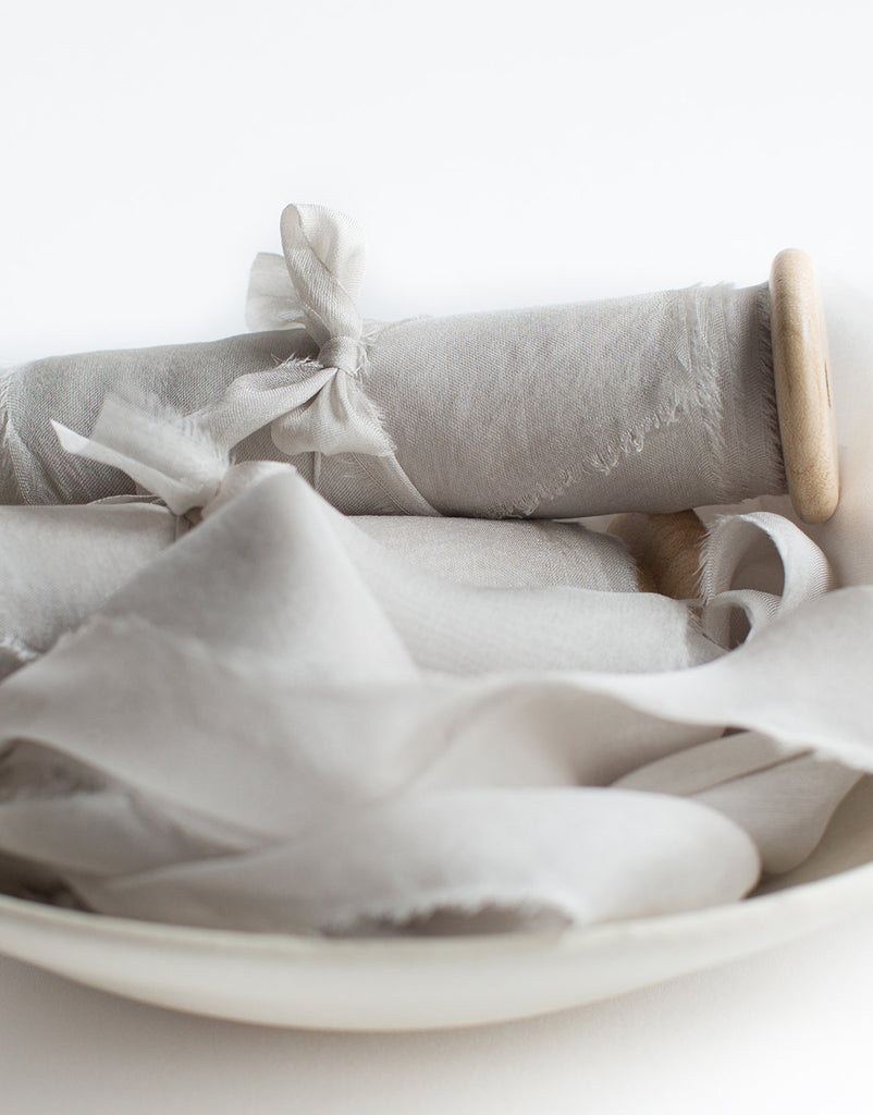 Our seamless hand dyed ribbons are often blends of many pigments, resulting in a complex yet subtle interplay of nuances. Every step of our ribbon process is by hand, from dyeing, to tearing into ribbon widths, fraying and then pressing. Our hand frayed ribbon ensures the softest edge possible. Our Ribbons are pressed and rolled onto spools, except our styling mix bundles and crinkle silk ribbon.