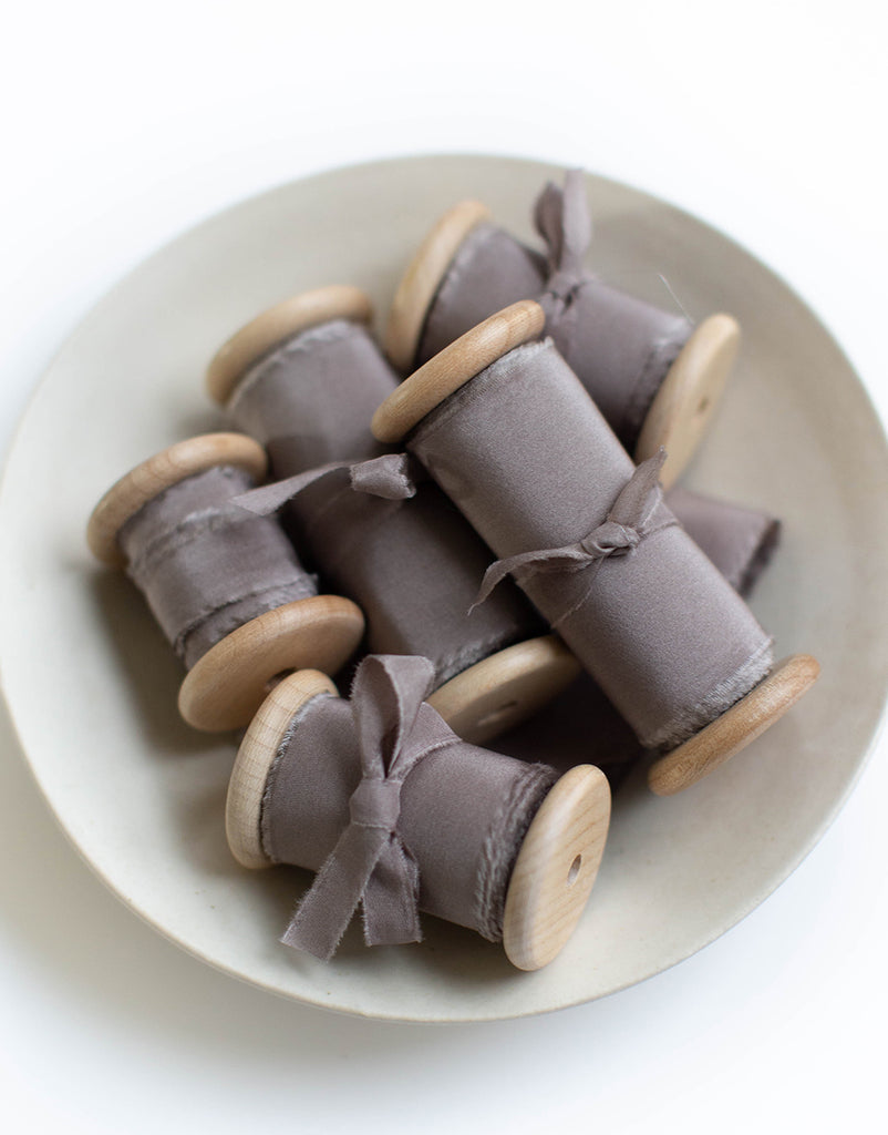 Our seamless hand dyed ribbons are often blends of many pigments, resulting in a complex yet subtle interplay of nuances. Every step of our ribbon process is by hand, from dyeing, to tearing into ribbon widths, fraying and then pressing. Our hand frayed ribbon ensures the softest edge possible. Our Ribbons are pressed and rolled onto spools, except our styling mix bundles and crinkle silk ribbon.
