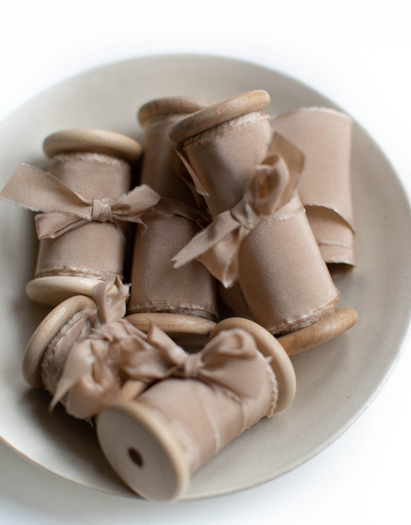 Our seamless hand dyed ribbons are often blends of many pigments, resulting in a complex yet subtle interplay of nuances. Every step of our ribbon process is by hand, from dyeing, to tearing into ribbon widths, fraying and then pressing. Our hand frayed ribbon ensures the softest edge possible.
