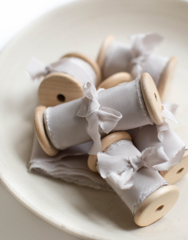 Our seamless hand dyed ribbons are often blends of many pigments, resulting in a complex yet subtle interplay of nuances. Every step of our ribbon process is by hand, from dyeing, to tearing into ribbon widths, fraying and then pressing. Our hand frayed ribbon ensures the softest edge possible. Our Ribbons are pressed and rolled onto spools, except our styling mix bundles and crinkle silk ribbon.