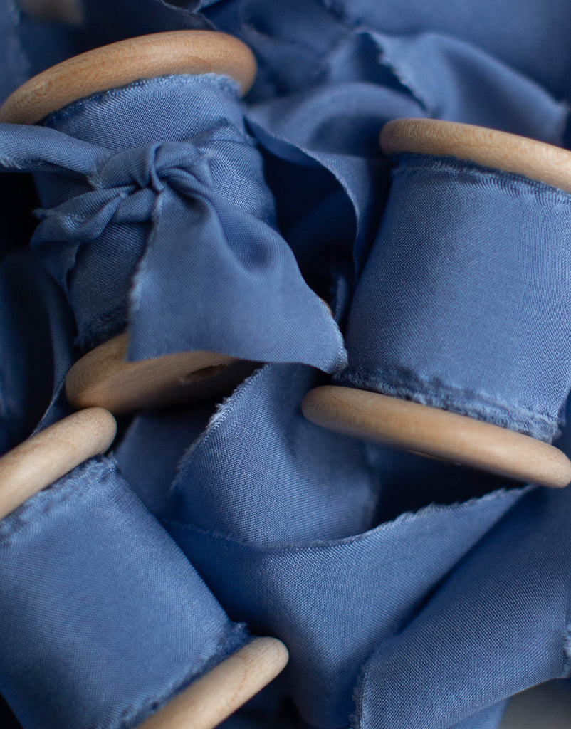 Our seamless hand dyed ribbons are often blends of many pigments, resulting in a complex yet subtle interplay of nuances. Every step of our ribbon process is by hand, from dyeing, to tearing into ribbon widths, fraying and then pressing. Our hand frayed ribbon ensures the softest edge possible.