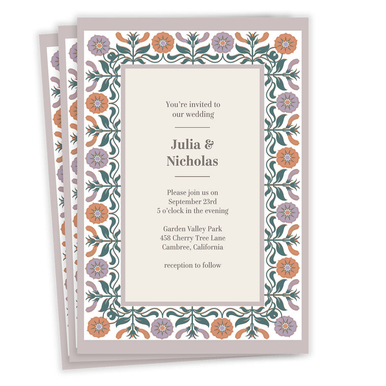 Create your own Hallmark wedding invitations. Just add names and event details, plus photos and a personal message, to send one-of-a-kind custom cards to family and friends. Design features an elegant, Arts and Crafts-style floral border in purple, peach and green, with pale purple lettering. Card stock has an uncoated finish for premium image quality with a smooth, non-glossy texture. Vertical card on flat card stock.