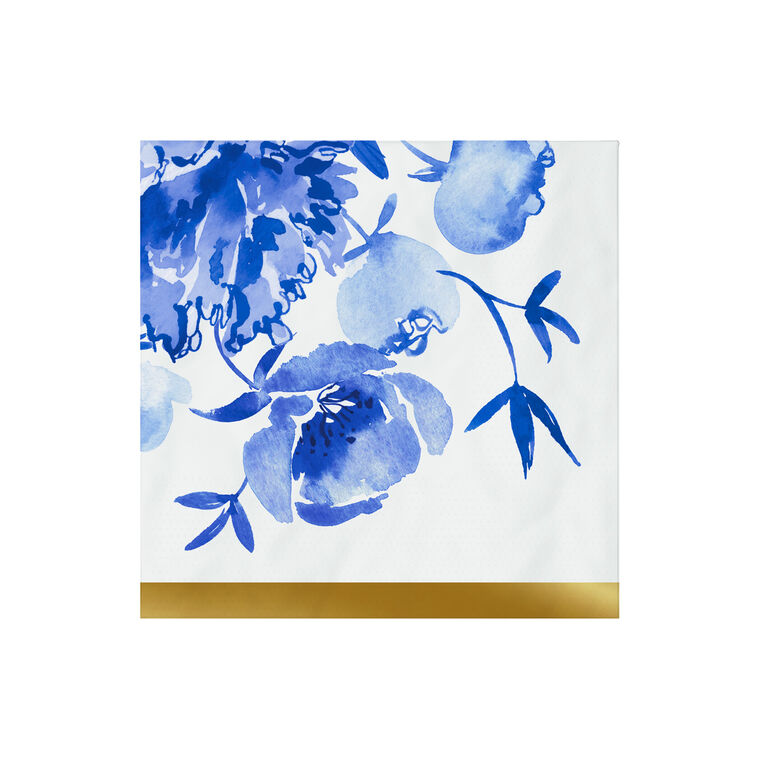 Create an air of elegance for your tablescape with these beautiful blue floral and white cocktail napkins. These paper napkins with cobalt blue flower designs and a broad gold foil lower edge make a great choice for wedding or baby showers, graduation parties, anniversaries and more.