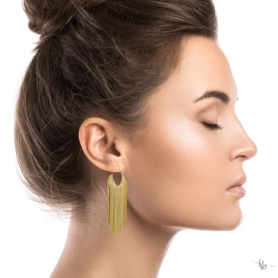Shine at every event wearing our Kai Fringe Chains, creating an effect that will make everyone's heads turn! 14k Gold plated chain fringe chandeliers. Measures at: 3".Hypoallergenic, nickel free.