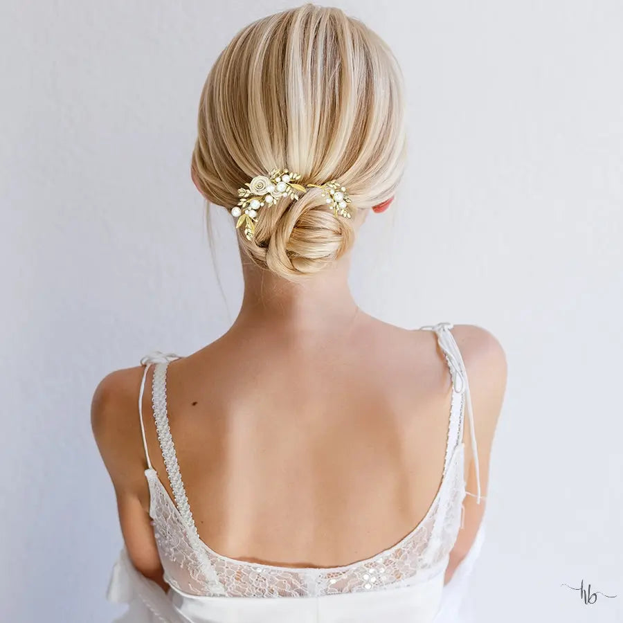 Small and Large gold filigree and pearl designed hair clips. Choose one, or pair two or three together. Model is wearing all three.