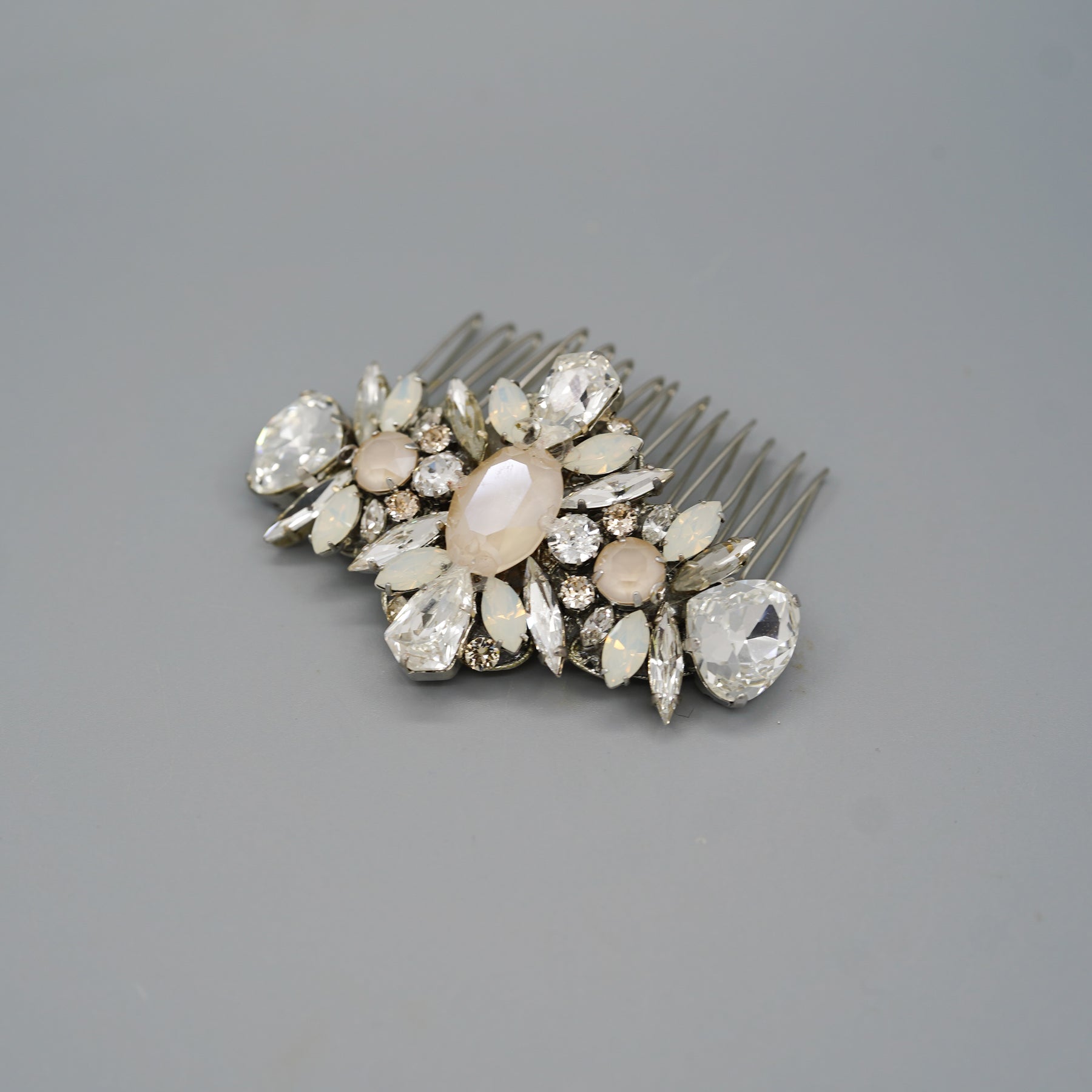 Our Raven Hair Comb is designed to be worn to the side, front or back. Features Austrian Crystal Rhinestones hand set on brooches, and wire wrapped onto gold plated and rhodium combs, that slide effortlessly into your hair style. Place the Comb over your tulle veil comb or wear as a tiara, or side accent to your wedding day hair style.Want this design in all clear? Absolutely!