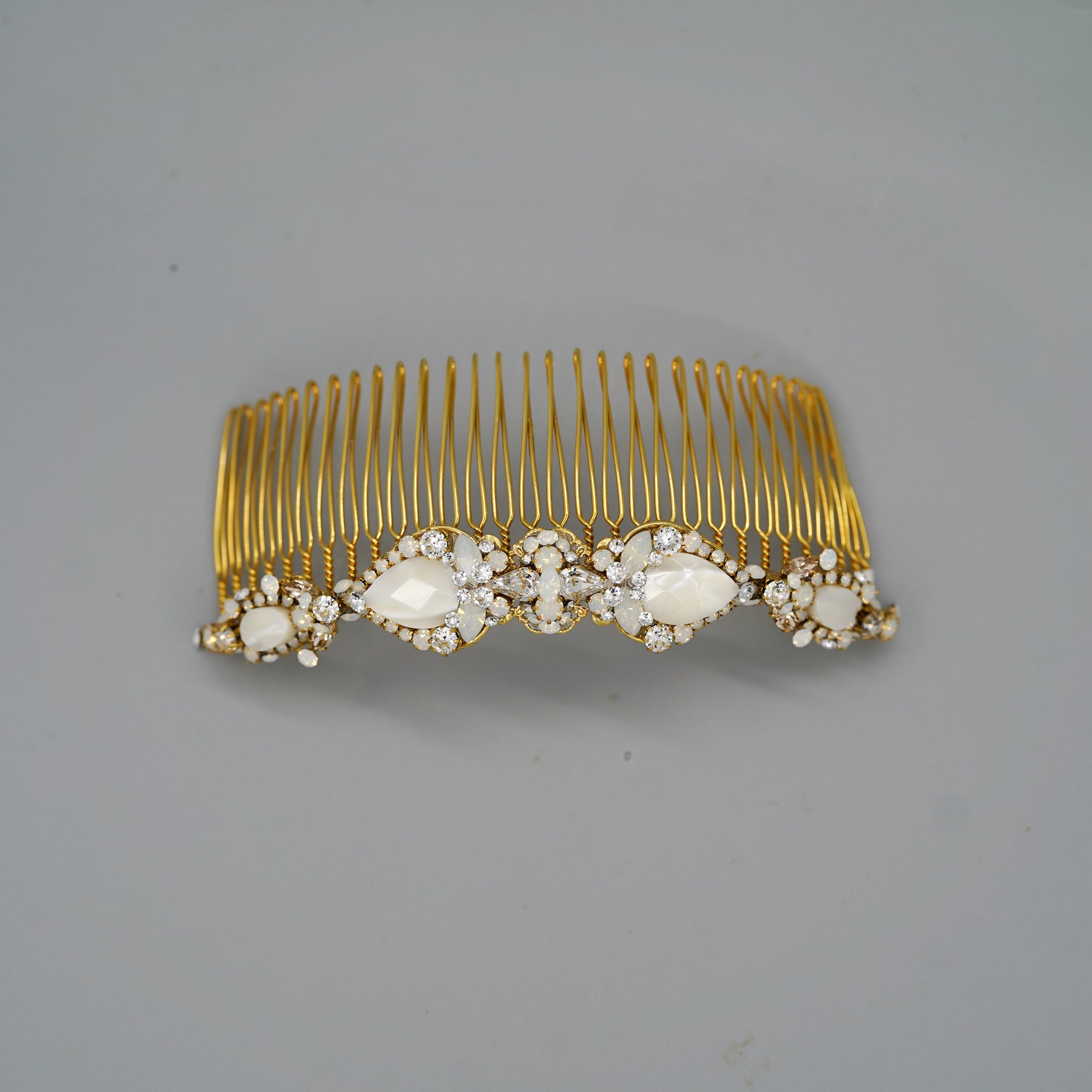 Our LennonHair Comb is designed to be worn as a tiara stylethe front or flipped upside down in the back to accent and cover the veil comb.Features Austrian Crystal Rhinestones and Mother of Pearl, hand set on brooches, and wire wrapped onto gold plated and rhodium combs, that slide effortlessly into your hair style.